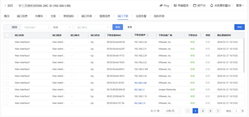 针对网络设备管理的端口下联功能,可结合网络设备的LLDP邻居表、ARP表、Mac表信息,展示网络端口下联(直接或间接)哪些设备,展示内容包括端口名称、端口描述、端口模式、端口状态、下联设备Mac、下联设备IP、下联设备厂商、下联状态、邻居等信息。