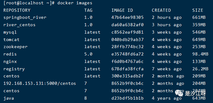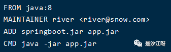 ① 定义父镜像:FROM java:8② 定义作者信息:MAINTAINER itheima <itheima@itcast.cn>③ 将jar包添加到容器:ADD springboot.jar app.jar④ 定义容器启动执行的命令:CMD java –jar app.jar⑤ 通过dockerfile构建镜像:docker bulid –f dockerfile文件路径 –t 镜像名称:版本docker bulid –f ./springboot_dockerfile -t springboot_river:1.0 .