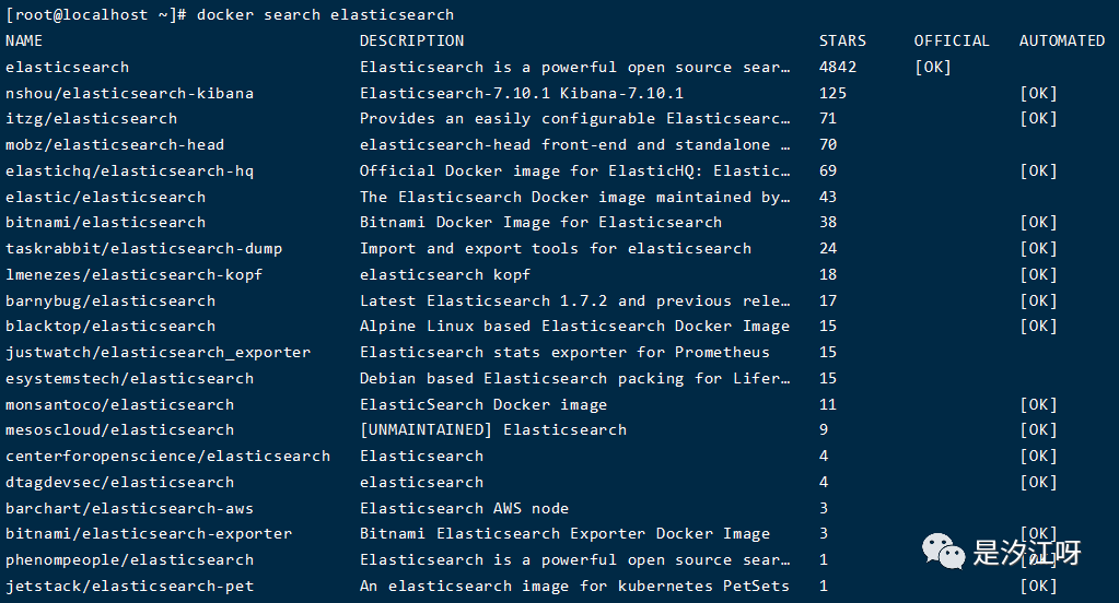 • docker search 镜像名称 中镜像每个字段表示的含义• NAME:镜像名称• DESCRIPTION:镜像描述• STARS:用户评价,反应一个镜像的受欢迎程度• OFFICIAL:是否官方创建• AUTOMATED:自动构建,表示该镜像由Docker Hub自动构建流程创建的