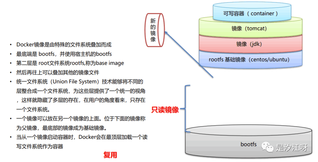 1.Docker镜像本质是是一个分层的文件系统2.Centos的iso镜像文件包含bootfs和rootfs,而docker的centos镜像复用操作系统的bootfs,只有rootfs和其他镜像层3.由于docker中镜像是分层的,tomcat虽然只有70多MB,但他需要依赖于父镜像和基础镜像,所有整个对外暴露的tomcat镜像大小500多MB