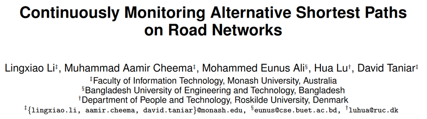 本周推荐的是发表于VLDB 2020的论文:Continuously Monitoring Alternative Shortest Paths on Road Networks,该文研究如何为不断在一条路径上移动的用户持续提供k条备选路径,作者来自莫纳什大学、孟加拉工程技术大学和罗斯基勒大学。