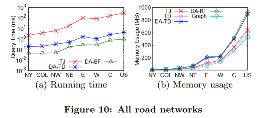 该文在大型真实道路网络上进行了全面的实验研究,结果表明所提出的算法比直接算法快几个数量级,结果如下图所示。