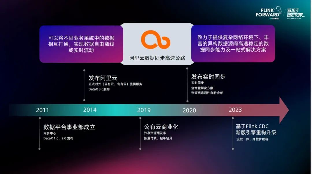 阿里云 DataWorks 数据集成发展已经超过 10 年,起步于 2011 年的阿里巴巴内部数据平台事业部同步中心。2014 年正式对外提供云服务功能,2019年完成公共云商业化,发布了独享资源组功能。2020年发布了实时同步,支持整库全增量以及资源连通性自助诊断等功能。2023 年初,基于 Flink CDC 重构后的新版引擎功能正式发布上线,具备流批一体、弹性扩缩容等功能特性。