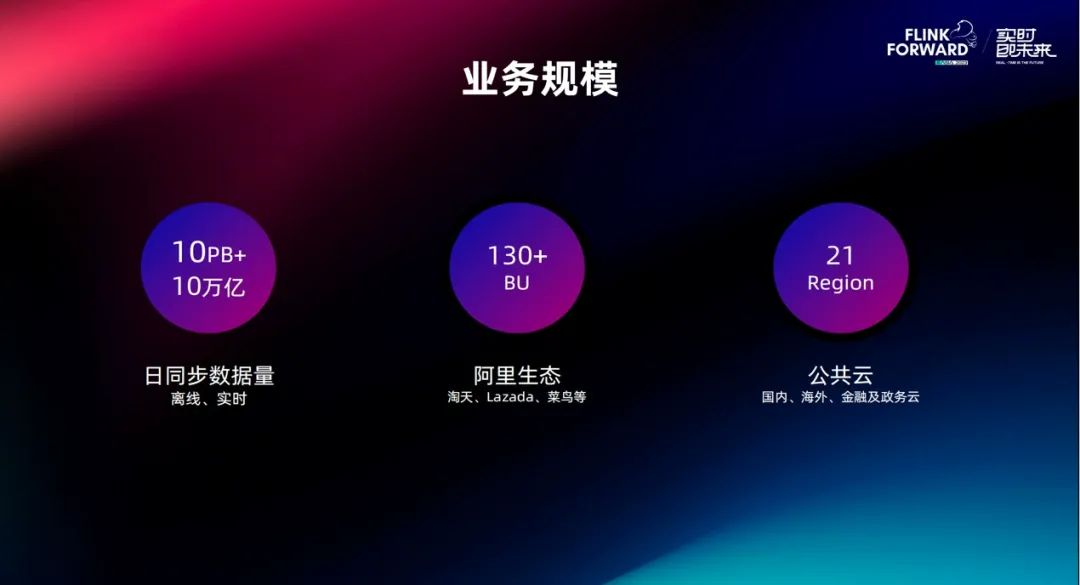 目前业务规模离线和实时,每天同步的数据量在10PB量级、10万亿量级。服务阿里巴巴内部淘宝、天猫、Lazada、菜鸟等130多个BU,同时支持国内、海外Region,金融云、政务云等21个 Region。