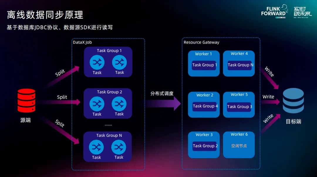 例如:用户购买 1,000万 的数据,要周期性离线同步到阿里云大数据存储系统上,做离线数仓分析,我们会在源端对其进行数据分片切分,针对不同的数据字段类型,有多种不同的切分算法,最常见的就是按照主键,进行数据分片切分,每一个切分后的分片就是一个 Task,若干个 Task 分为一个 Task Group,被调度系统调度到资源层 Worker 上进行同步,Worker 是进行数据实际读写的基本物理执行单元,这样就能够完成离线同步的能力。