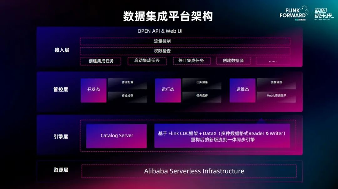 第二层是管控层,管控层主要负责任务的全生命周期的管理,包括开发态(作业配置、作业检查),运行态(任务渲染、任务启停),运维态(告警监控、Metric 查询展示)等。