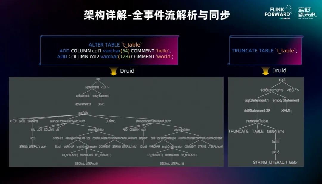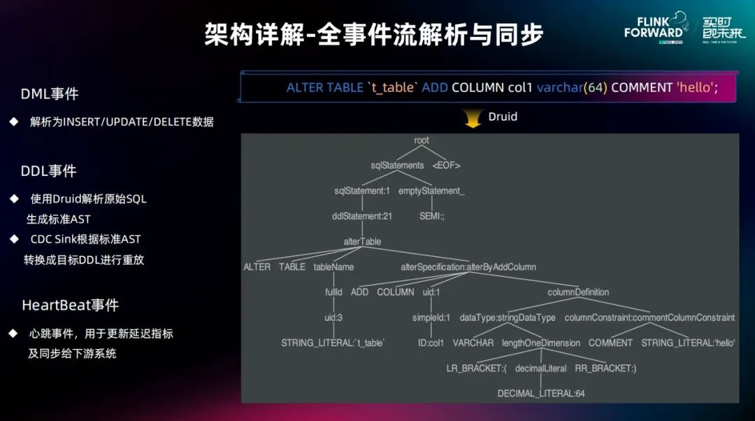 首先针对 DML 事件,会将其解析为 INSERT、UPDATE 或 DELETE 数据,如果是全量初始化数据 DML 事件会全部解析为 INSERT 数据。HeartBeat 事件,主要用于更新延迟指标、及同步给下游系统起到保活作用等。DDL事件,将原始的 DDL SQL 变更基于 Druid 解析为标准的 AST 抽象语法树,所有的目标端 Sink Connector 对接标准的 AST 抽象语法树,将其转换为目标端可执行的 DDL 事件进行重放,无需关心源端的数据库类型。