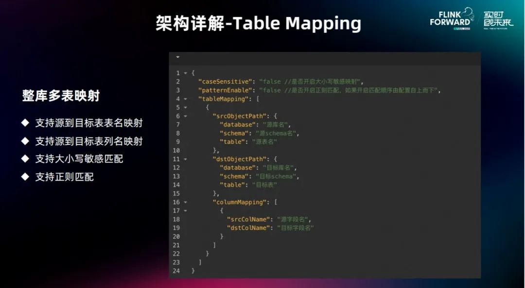 Table Mapping 支持源端表到目标表表名及列名映射,例如:在分库分表场景下,要支持用户的表名正则匹配,需要将满足用户自定义的正则条件下的表,数据都同步写到目标端某一个表里,就需要依赖于 Table mapping 映射的能力。在离线同步场景下,需要兼容现有的离线同步能力,用户除表名映射以外,用户的源端字段列名和目标端字段列名也不一定相同,则还需要进行列名映射。