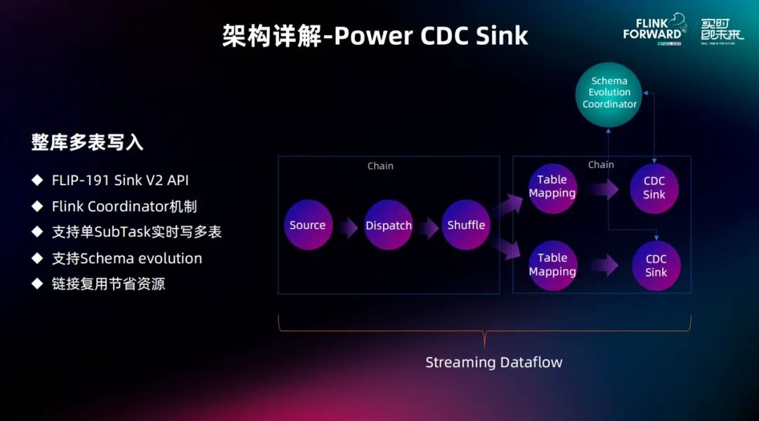 Power CDC Sink 是基于 Flink FLIP-191 Sink V2 以及 Coordinator 机制进行了增强,支持单 SubTask 实时写多表,支持链接复用以节省资源,同时支持实时的 Schema Evolution。