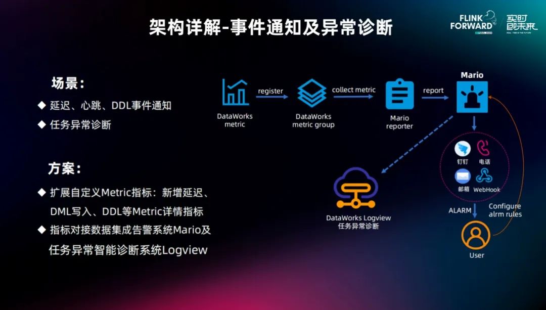 实时同步任务因为是 7 * 24 小时运行,用户需要能够对其有比较强的可观测性,为了提升任务的可观测性,新版引擎扩展新增了大量可观测指标,当任务出现故障或收到预期外的事件时,任务会将 Metric 实时推送到我们自研的报警系统 Mario, Mario 在收到 Metric 后根据用户设定的告警规则自动触发告警用户介入处理。例如:用户在 DataWorks 数据集成平台上配置了任务心跳告警、任务延迟告警、 DDL 事件通知报警,当出现任务延迟、任务异常失败或者出现其它预期外的事件,能够及时以短信、电话、钉钉、Webhook 等多种方式告警到用户,用户能够及时到数据集成运维平台上做任务运维处理。数据集成运维平台支持 Logview 可视化异常诊断,帮助客户分析任务延迟、异常等原因并提供相应的解决建议,提升客户运维效率。