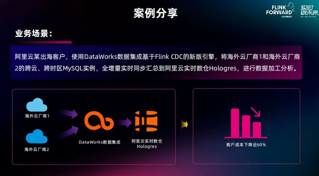 阿里云某出海客户,使用 DataWorks 数据集成基于 Flink CDC 的新版引擎,将海外云厂商 1 和海外云厂商 2 的跨云、跨时区 MySQL 实例,全增量实时同步汇总到阿里云实时数仓 Hologres,做实时数仓分析。基于任务执行调度可以弹性扩缩容,以及新版引擎 Power CDC Sink 支持连接复用写多表等能力特性,可以为客户带来较大的资源成本优化, 用户成本下降近 60%。