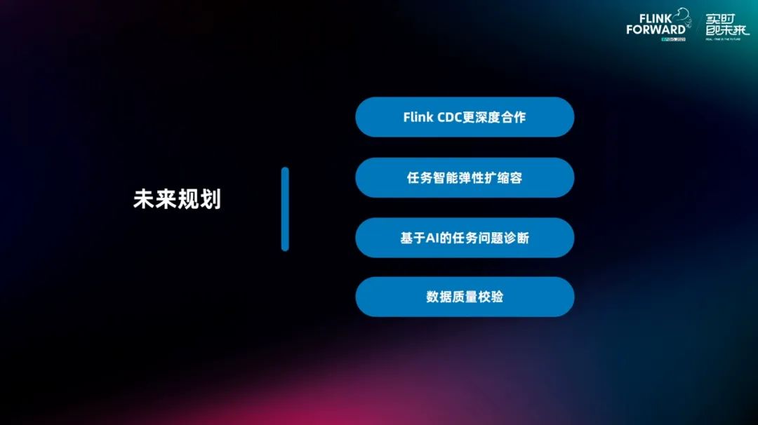 未来 DataWorks 与 Flink CDC 会更加紧密深度的合作,在数据集成引擎的通用能力上期望和社区共同演进,在任务智能弹性扩容方面进行更多维的探索,进一步帮助客户降本增效。同时能够基于 AI 对任务进行问题的智能诊断,帮助用户更加高效便捷的排查,降低用户的问题排查门槛。最后在数据离线实时质量校验方面,进一步推进使其产品落地。