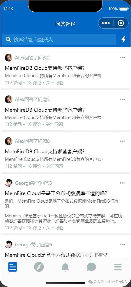 本示例小程序是一个模仿知乎的简约小程序,小程序的后端服务使用了MemFire Cloud,其中使用到的MemFire Cloud功能包括: