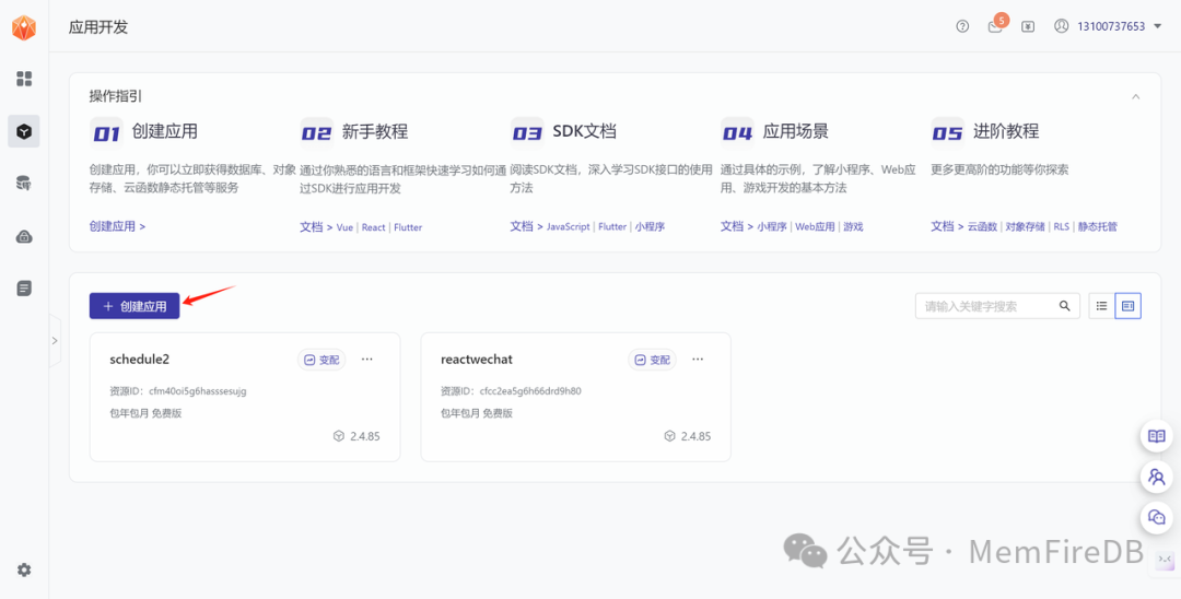 登录MemFire Cloud, 在“我的应用”页面创建一个新应用