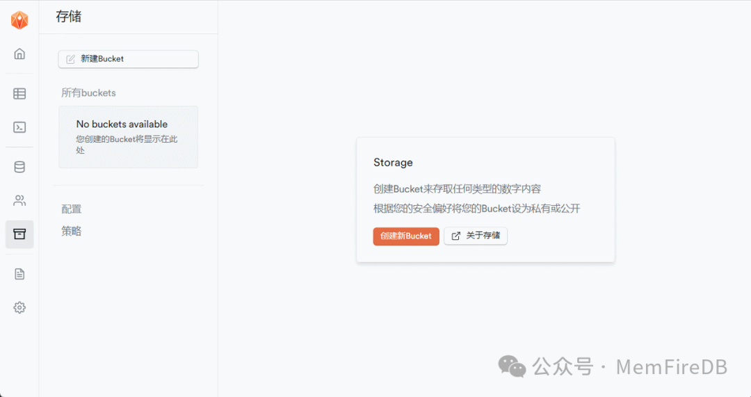 点击‘存储’图标菜单,点击‘创建新bucket’,创建images存储桶,存储桶是用来上传外卖小程序里面所有需要图片的物料。