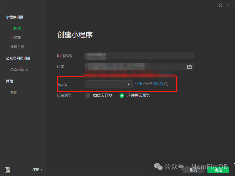 选择目录是下载好的小程序项目的目录,AppID为您在微信公众平台注册小程序获得的专属appid。
