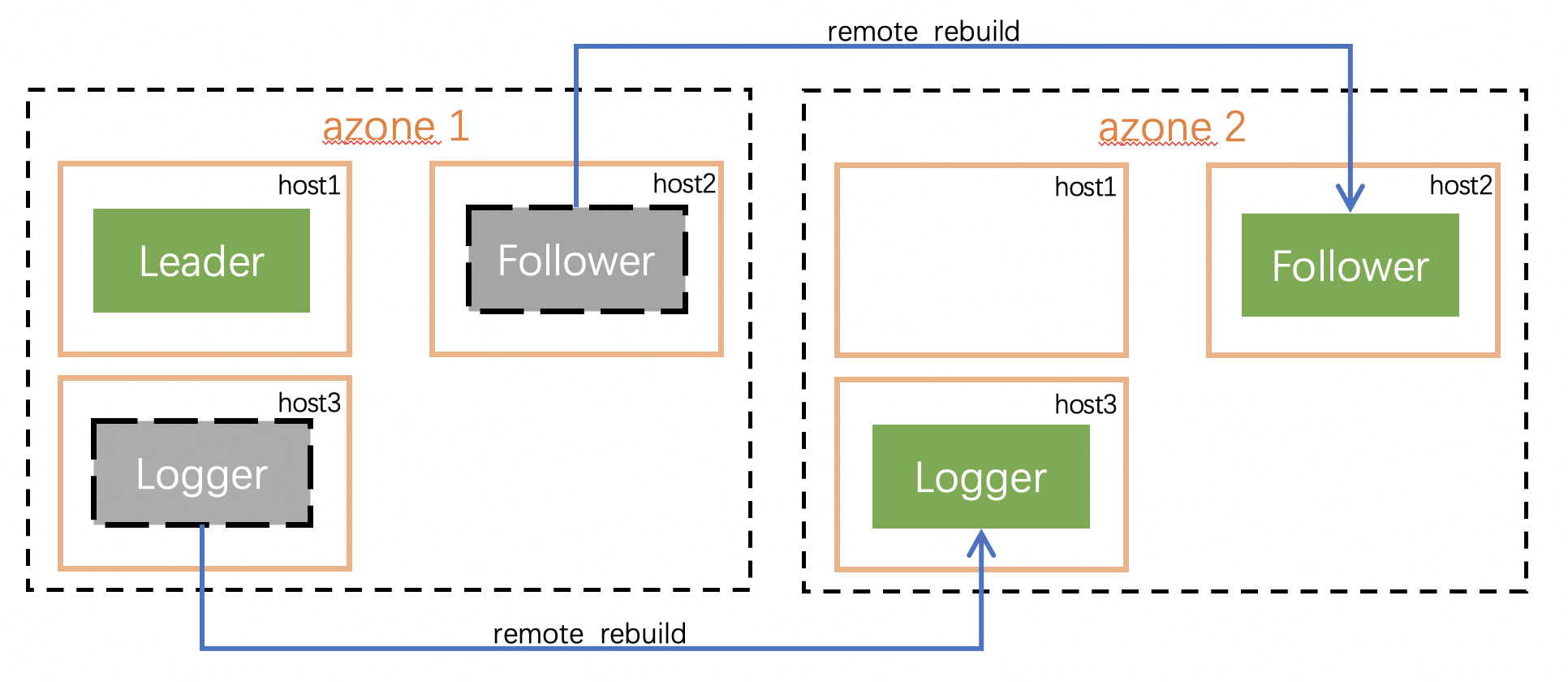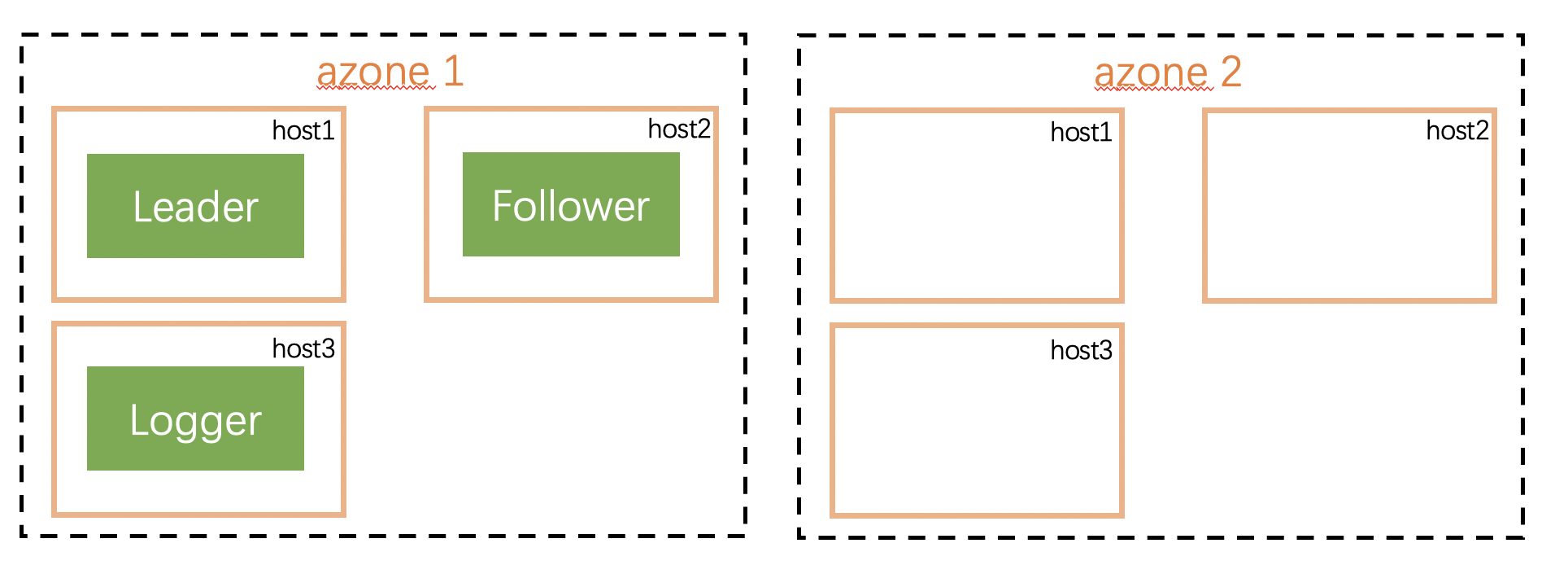首先,我们可以通过备库重搭中指定主机重搭的方式,将follower节点和logger节点分别迁移到可用区2里的主机2和主机3上,如下图所示: