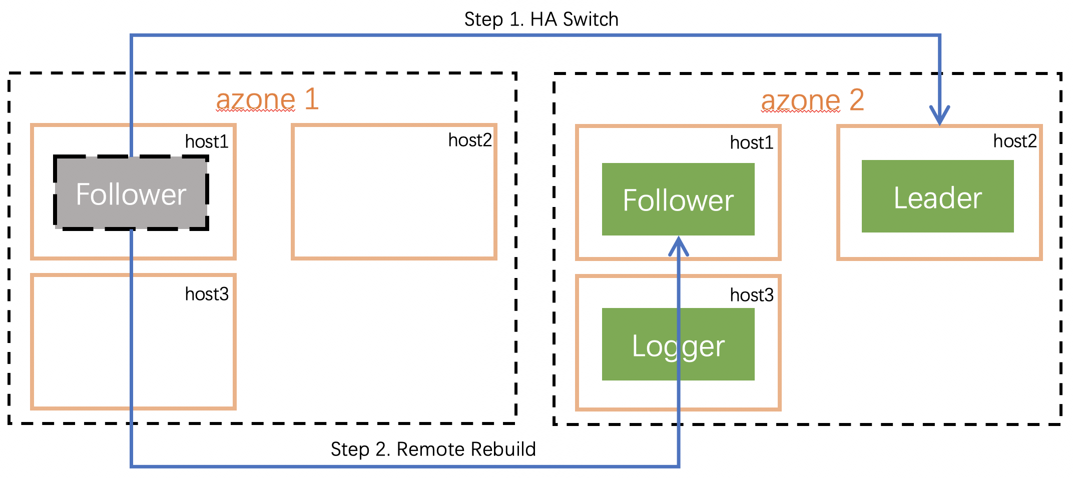 接下来,做一次主动HA切换,将Leader角色切换到可用区2的主机2上,接着在使用指定节点跨机备库重搭,将可用区1的主机1上的follower节点迁移到可用区2的主机1上,如下图所示: