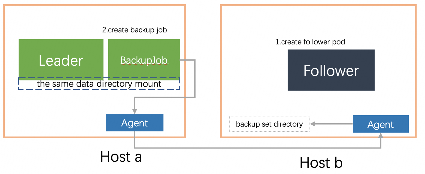 对Follower重搭时候,首先确定一个目标的主机,在这个host上恢复出一个follower节点来,在跨机重搭的时候,我们可以通过创建一个配置和原Follower Pod一样的临时pod,由k8s调度器将pod调度到合适的主机上,来确定目标主机。确定Leader Pod、目标主机,我们便可以利用DN专用的备份工具发起一次流式备份,让备份集直接落盘到目标主机上。