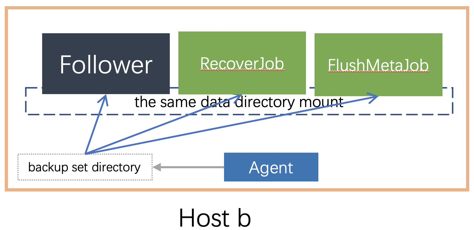 备份完成后,发起RecoverJob,恢复任务的Pod的挂载目录包括Follower的数据目录和备份集目录,使用备份工具发起恢复任务,主要为回放redo日志,并把数据文件从备份集目录移动到Follower的数据目录。相比普通MySQL的恢复流程,我们的DN还需要做一次刷新三节点元数据的操作,主要告诉当前节点自己是Follower还是Logger,还有其他节点的地址信息。