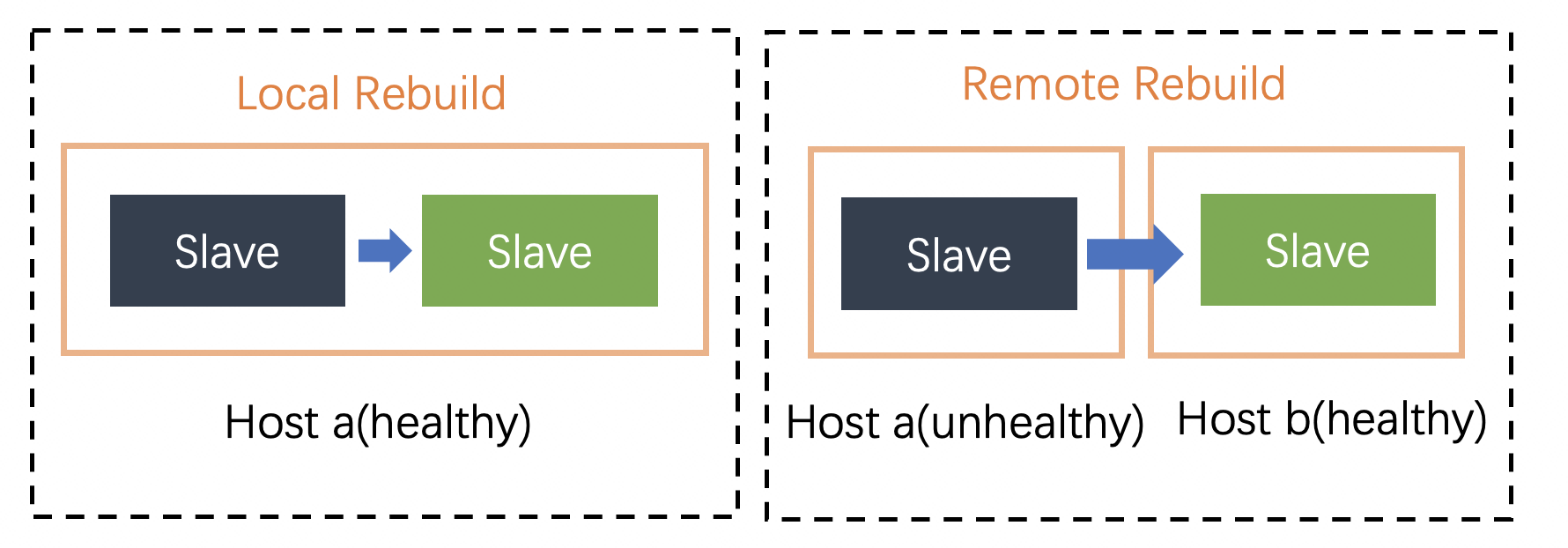 顾名思义,本机备库重搭的意思是follower节点在原来的宿主机上进行重建,跨机备库重搭则表示follower节点不在原来的宿主机上进行重建。运维任务可以根据实际需求在下发备库重搭任务时候指定是否跨机重搭,比如机器资源不足的时候,而原宿主机仍然健康,则可以选择本机备库重搭,反之本机不健康且机器资源充足,则建议选择跨机重搭。