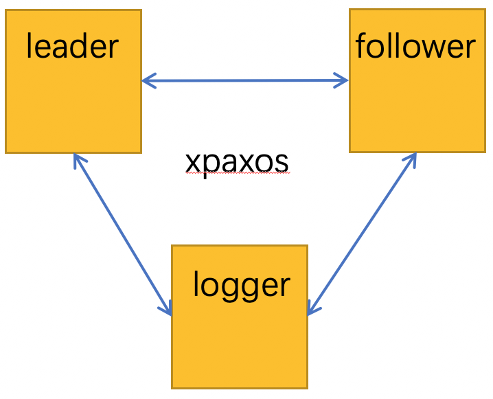 一个XDB实例,由leader、follower、logger节点构成,三个节点通过xpaxos协议通信并实现多数派决策,形成了一个paxos group,三个节点均会在本地持久化consensus log,另外Leader和Follower还存有mysql数据文件(回放consensus log所得),当Follower升级为Leader时,可以利用mysql数据文件对外提供服务。