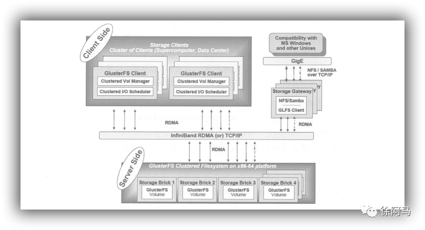GlusterFS借助TCP/IP或InfiniBand RDMA网络将分散的存储资源汇聚在一起,统一提供存储服务,并使用单一全局命名空间来管理数据。GlusterFS基于可堆叠的用户空间以及无元的设计,可为各种不同的数据负载提供优异的性能。