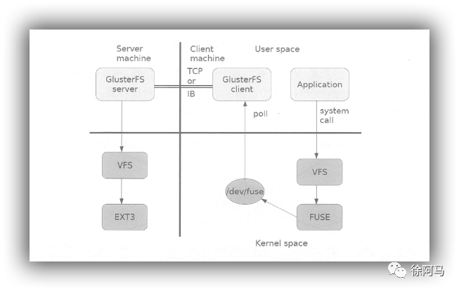 (3)VFS将数据递交给FUSE内核文件系统,并向系统注册一个实际的文件系统FUSE,而FUSE文件系统则是将数据通过/dev/fuse 设备文件递交给了GlusterFS client 端,可以将FUSE文件系统理解为一个代理。