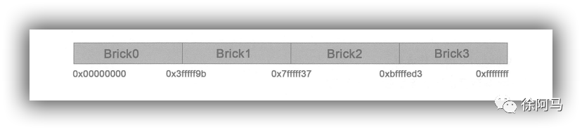 现在我们假设创建了一个包含四个Brick节点的GlusterFS卷,在服务端的Brick 挂载目录会给四个Brick平均分配2”的区间的范围空间,GlusterFS hash分布区间是保存在目录上而不是根据机器去分布区间。如图13.4所示,Brick*表示一个目录。分布区间保存在每个Brick 挂载点目录的扩展属性上。