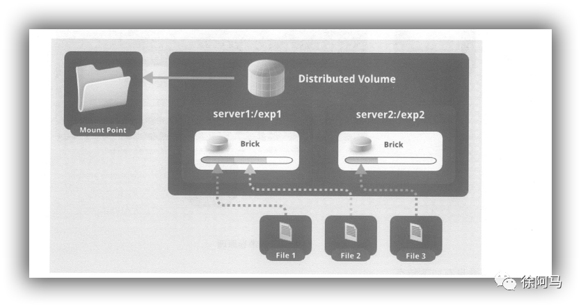 分布式卷是GlusterFS的默认卷,在创建卷时,默认选项是创建分布式卷。在该模式下,并没有对文件进行分块处理,文件直接存储在某个Server节点上。直接使用本地文件系统进行文件存储,大部分Linux命令和工具可以继续正常使用。需要通过扩展文件属性保存HASH值,目前支持的底层文件系统有ext3.ext4、ZFS、XFS等。