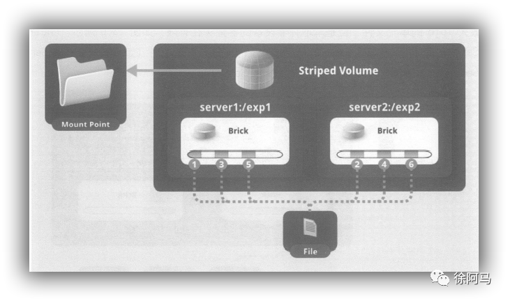 条带卷(Stripe volume):类似RAIDO,文件被分成数据块并以轮询的方式分布到多个Brick Server上,文件存储以数据块为单位,支持大文件存储,文件越大,读取效率越高。