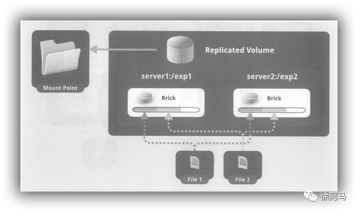 复制卷(Replica volume):将文件同步到多个Brick上,使其具备多个文件副本,属于文件级RAID1,具有容错能力。因为数据分散在多个Brick中,所以读性能得到很大提升,但写性能下降。