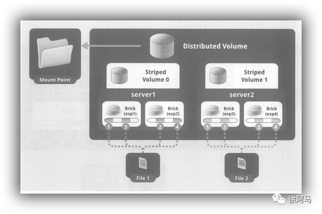 如图所示,File1和File2通过分布式卷的功能分别定位到Server1和Server2。在Server1中Filel 被分割成4段,其中1、3在Server1中的exp1目录中,2.4在Server1中的exp2日录中,在Server2中,File2也被分割成4段,其中1、3在Server2中的exp3目录中,2.4在Server2中的exp4目录中。