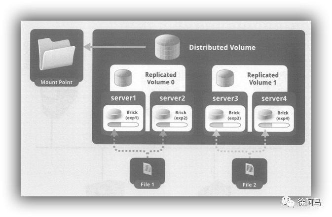 分布式复制卷兼顾分布式卷和复制卷的功能,主要用于需要冗余的情况下。如图所示,File1和File2通过分布式卷的功能分别定位到Server1和Server2。在存放File1时,File1根据复制卷的特性,将存在两个相同的副本,分别是Server1中的exp1目录和Server2中的exp2目录。在存放File2时,File2根据复制卷的特性,也将存在两个相同的副本,分别是Server3中的exp3目录和Server4中的exp4目录。