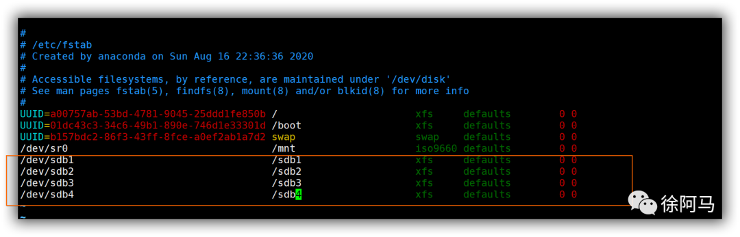 开启4台虚拟机,根据表添加磁盘,通过fdlisk分区,mkfs格式化,创建相应的挂载目录,并将格式化的磁盘挂载到相应的目录中,最后修改/etc/fstab配置文件,这里以centos01为例(一路如图)