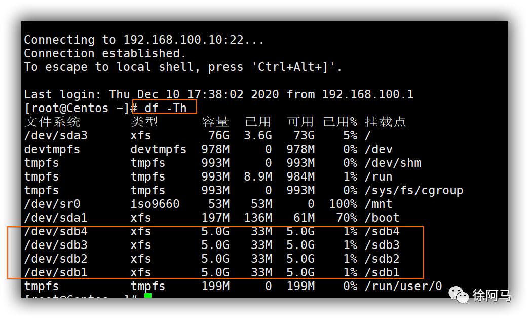 | centos01 | 192.168.100.10 | /dev/sdb1(5G) /dev/sdb2(5G) /dev/sdb3(5G) /dev/sdb4(5G) | /sdb1 /sdb2 /sdb3 /sdb4 |