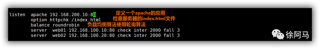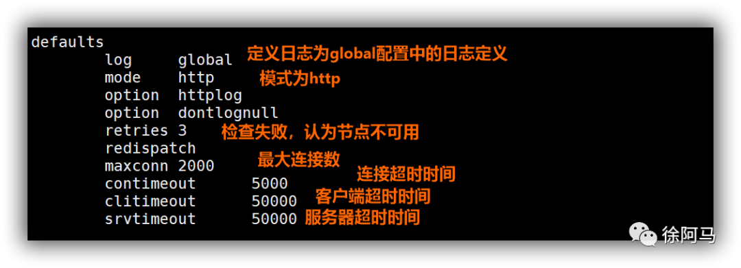 Haproxy配置文件通常分为三个部分,即global、defaults和listen。global为全局配置,defaults为默认配置,listen为应用组件配置。