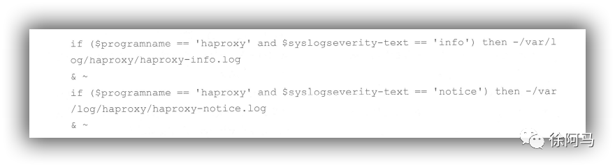 这部分配置是将Haproxy的info 日志记录到/var/log/haproxy/haproxy-info.log下,将notice日志记录到/var/log/haproxy/haproxy-notice.log下,其中“&~”表示当日志写入日志文件后,rsyslog停止处理这个信息。这里配置的语法是使用rainerscript脚本语言写的。
