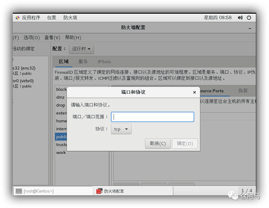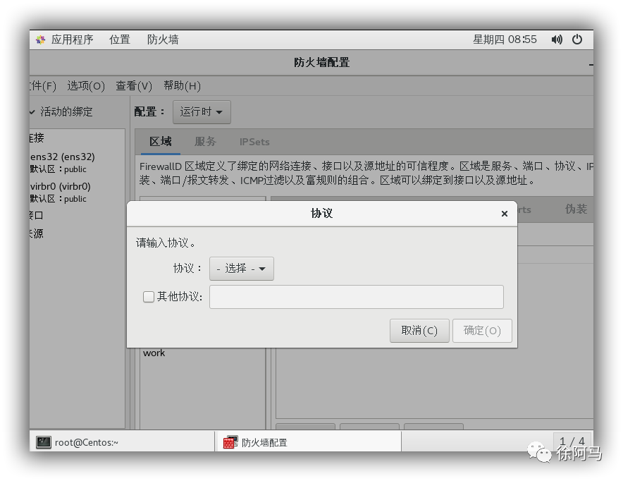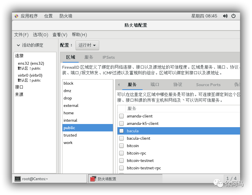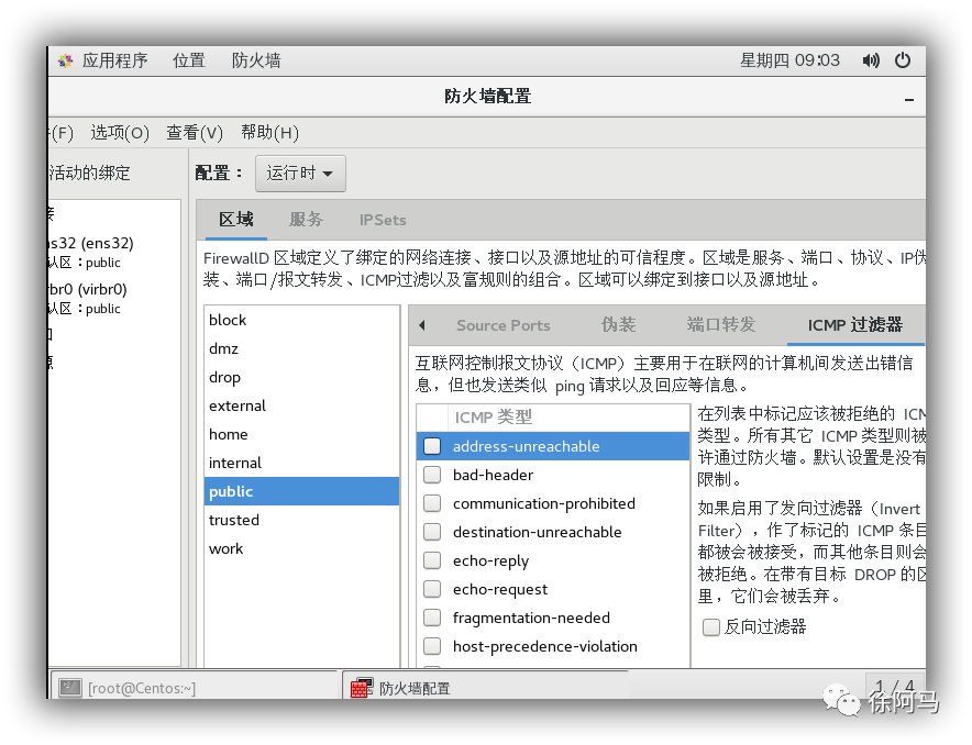 上图“配置”选项包括运行时和永久两种。运行时配置为当前使用的配置规则,永久配置规则在系统或服务重启时生效。在firewall-config界面中主要需要了解的是区域、服务、ICMP等设置的选项卡。