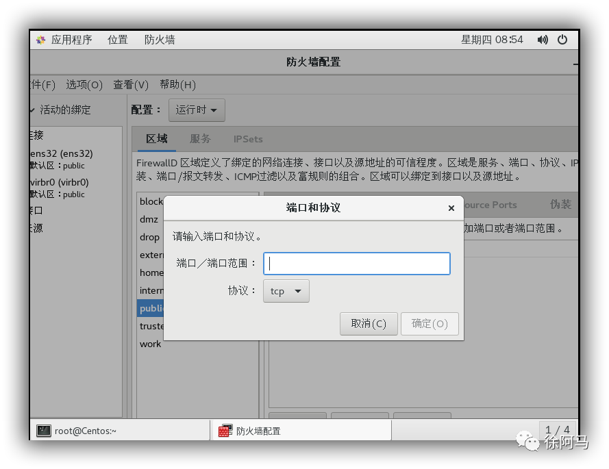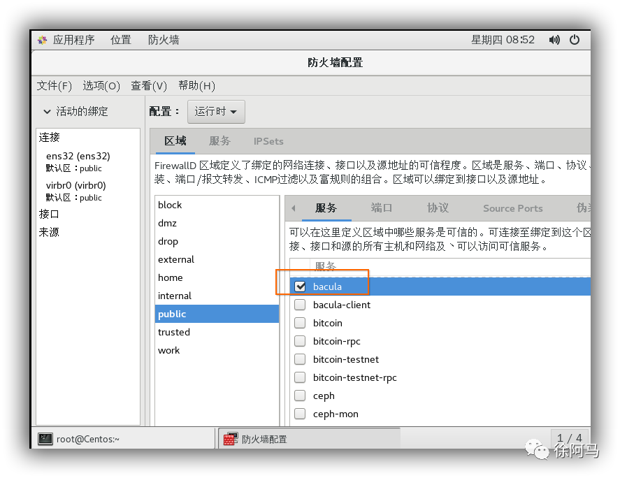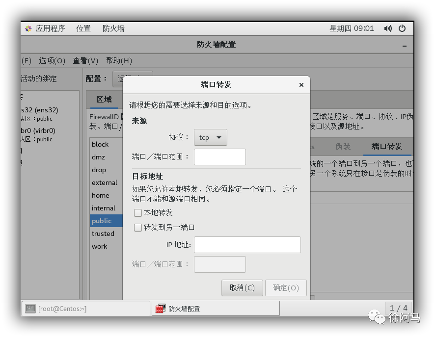 即可打开如下图所示的firewall-config 工作界面,或者直接在终端中输入firewall-config命令也可以打开此界面。