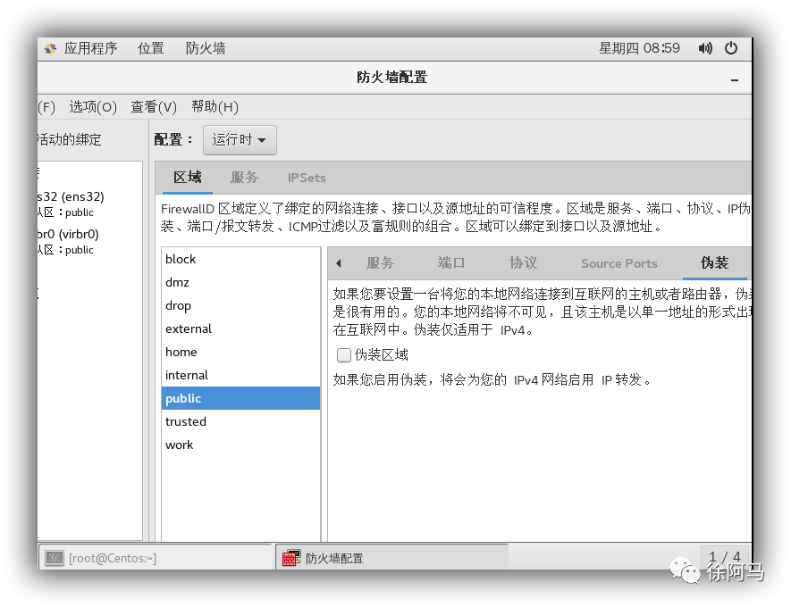 “区域”选项卡是一个主要设置的界面。“区域”选项卡下面还包含服务、端口、协议、源端口、伪装等一系列子选项卡。所以说,区域是服务、端口、协议、IP伪装、ICMP过滤等组合的意思,同时区域也可以绑定到接口和源地址。