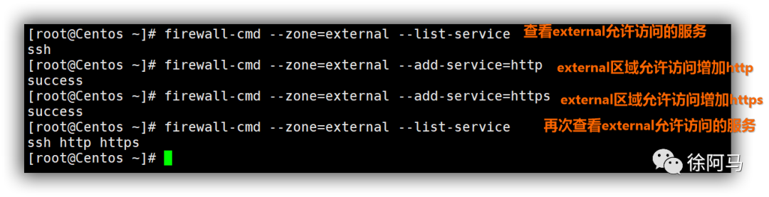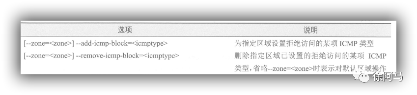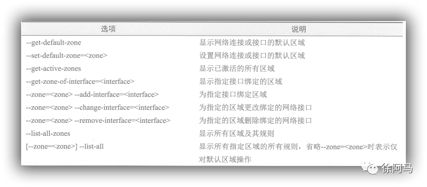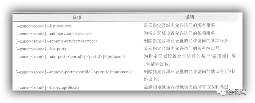 下图列出了firewall-cmd命令区域中服务管理的常用选项说明。