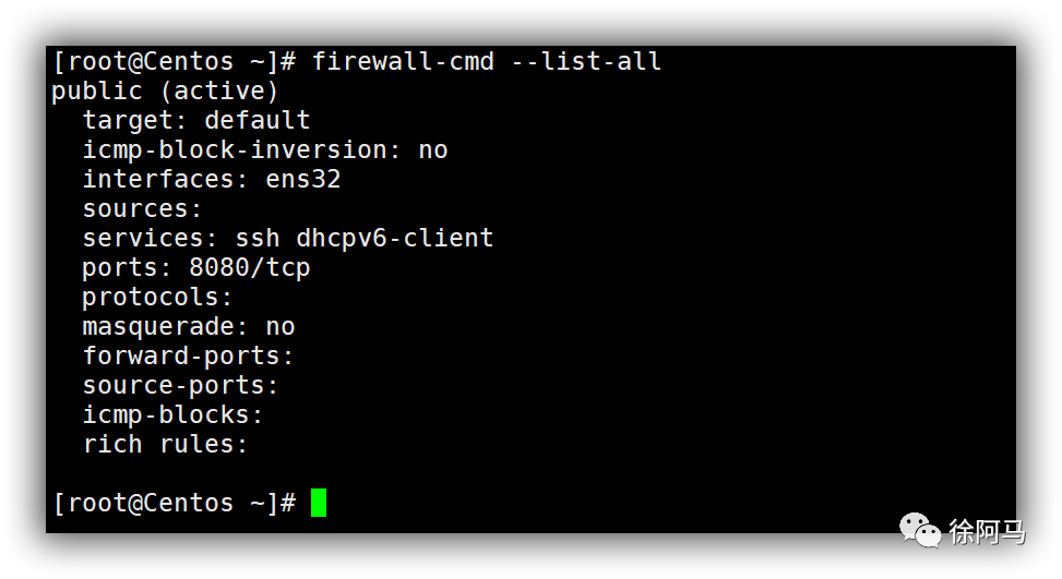 public(公共区域):除非与传出流量相关,或与ssh或dhcpv6-client预定义服务匹配,否则拒绝流量传入,在公共区域内,不能相信网络内的其他计算机不会对计算机造成危害,只能接收经过选择的连接。并且,该区域是新添加网络接口的默认区域。