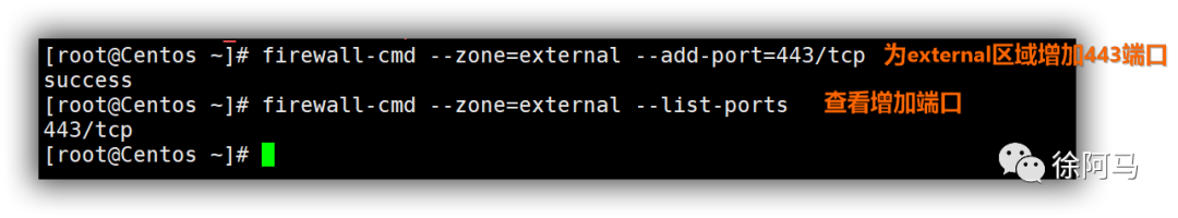 但是,对于非预定义的服务只能手动为指定的区域添加端口。例如,执行以下操作即可实现在internal区域打开443/TCP端口。