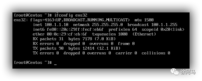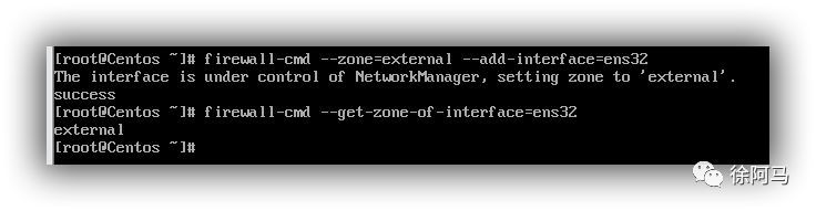 网关服务器连接互联网网卡ens32地址为100.1.1.10,为公网IP地址,分配到firewall的external(外部)区域;