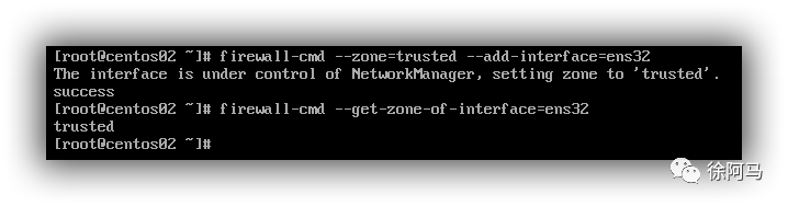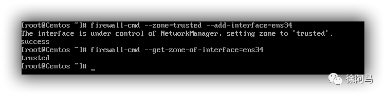 连接内网网卡ens34地址为192.168.1.1.分配到firewall的trusted(信任)区域: