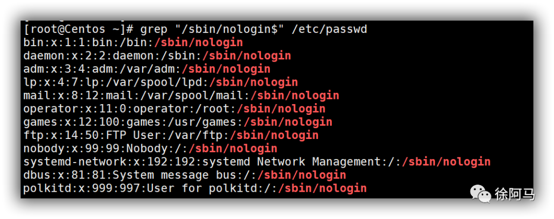 常见的非登录用户账号包括bin,daemon.adm、lp、mail等。为了确保系统安全,这些用户账号的登录Shell 通常是/sbin/nologin,表示禁止终端登录,应确保不被人为改动,如下所示: