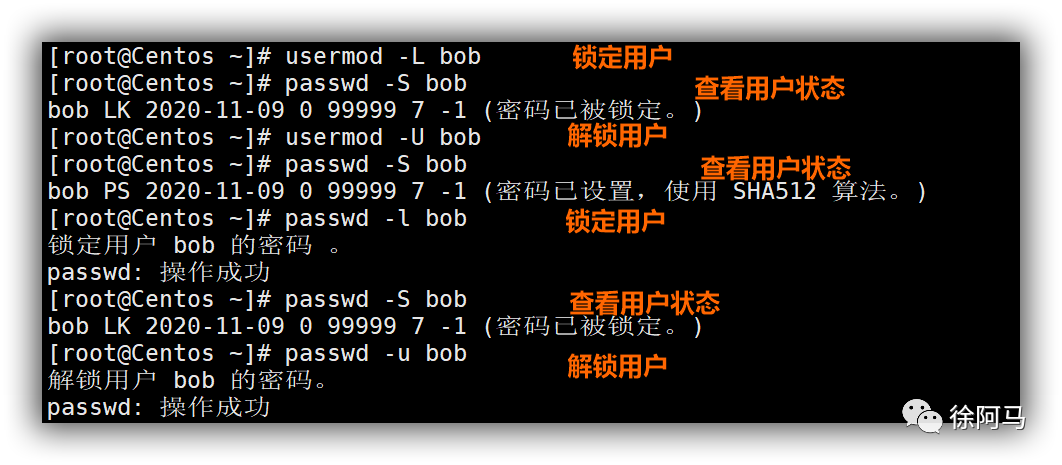 对于Linux服务器中长期不用的用户账号,若无法确定是否应该删除,可以暂时将其锁定。例如,若要锁定、解锁名为bob的用户账号,可以执行以下操作(passwd.usermod命令都可用来锁定、解锁账号)。