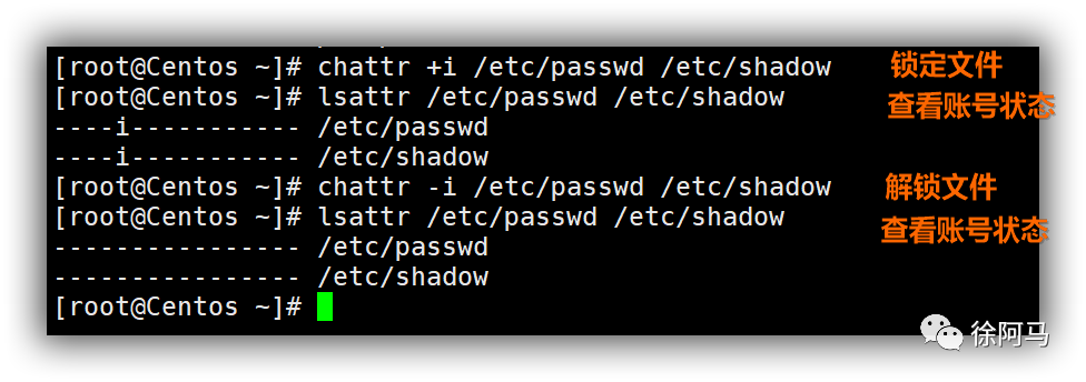 如果服务器中的用户账号已经固定,不再进行更改,还可以采取锁定账号配置文件的方法。使用chattr命令,分别结合“+i” “-i“选项来锁定、解锁文件,使用lsattr命令可以查看文件锁定情况。