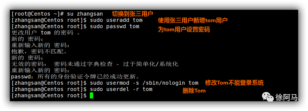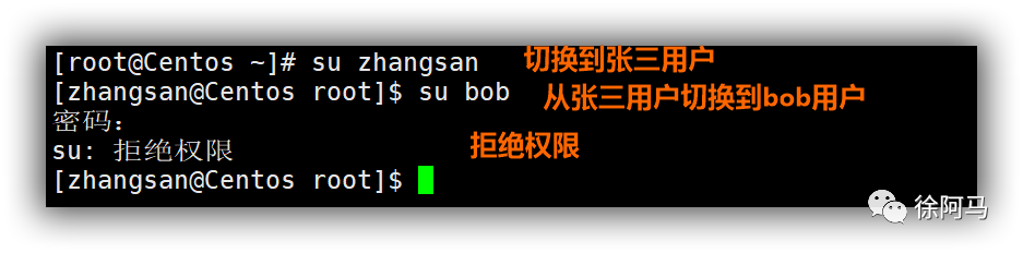 上图切换失败,拒绝权限的原因就是我们没有把用户张三加入到wheel组中,所以拒绝张三用户使用su命令。